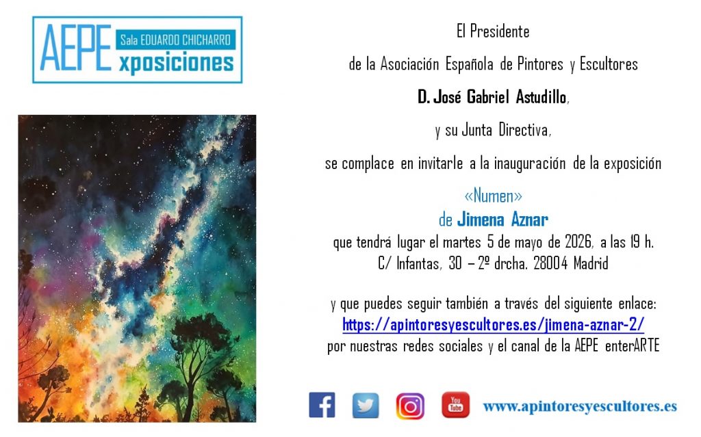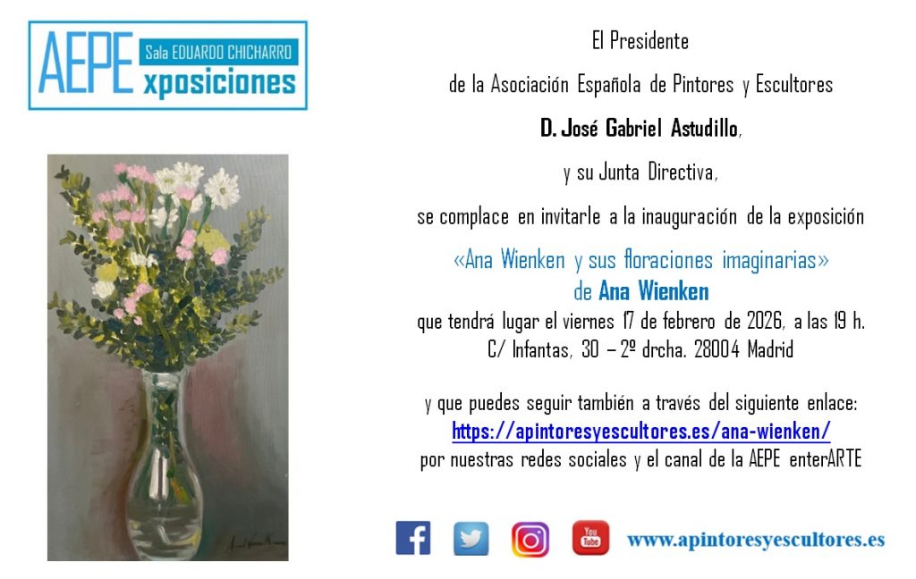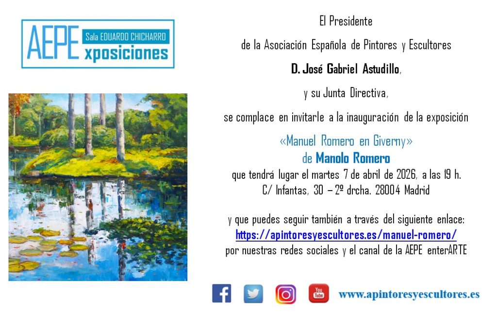 Todo ello puede seguirse además por el canal de la AEPE en Youtube y por las redes sociales en las que tiene presencia la Asociación Española de Pintores y Escultores.