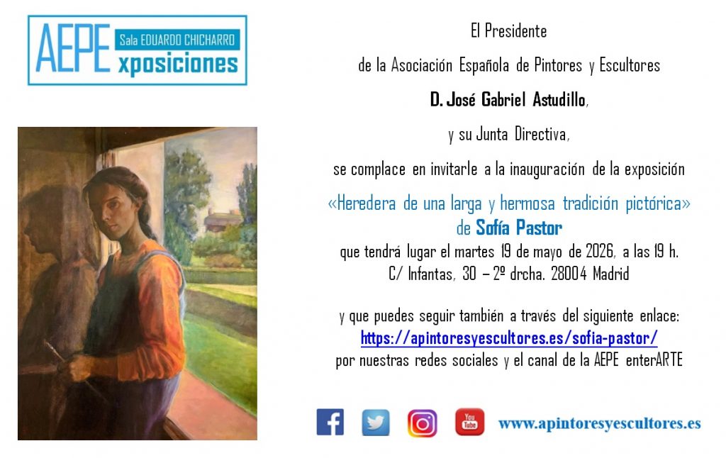 El 19 de mayo de 2026, en la Sala de Exposiciones «Eduardo Chicharro» de la Asociación Española de Pintores y Escultores, tendrá lugar el acto de inauguración de la exposición que bajo el título de «Heredera de una larga y hermosa tradición pictórica», nos presentará la socia Sofía Pastor.