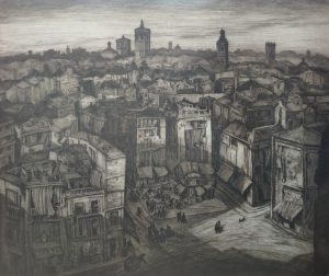 Marina Olalla. El coso de noche. Grabado. Aguafuerte y aguatinta. 30 x 90
