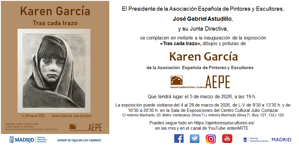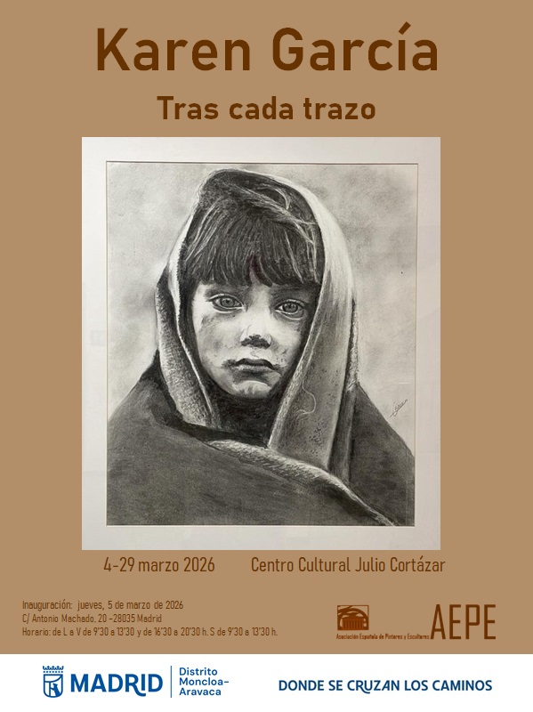 El próximo día 5 de marzo de 2026, a las 19 h. tendrá lugar el acto de inauguración de la exposición organizada por la Asociación Española de Pintores y Escultores, titulada «Tras cada trazo», de la socia Karen García, en la Sala de Exposiciones del Centro Cultural Julio Cortázar, perteneciente a la Junta Municipal del Distrito de Moncola-Aravaca.