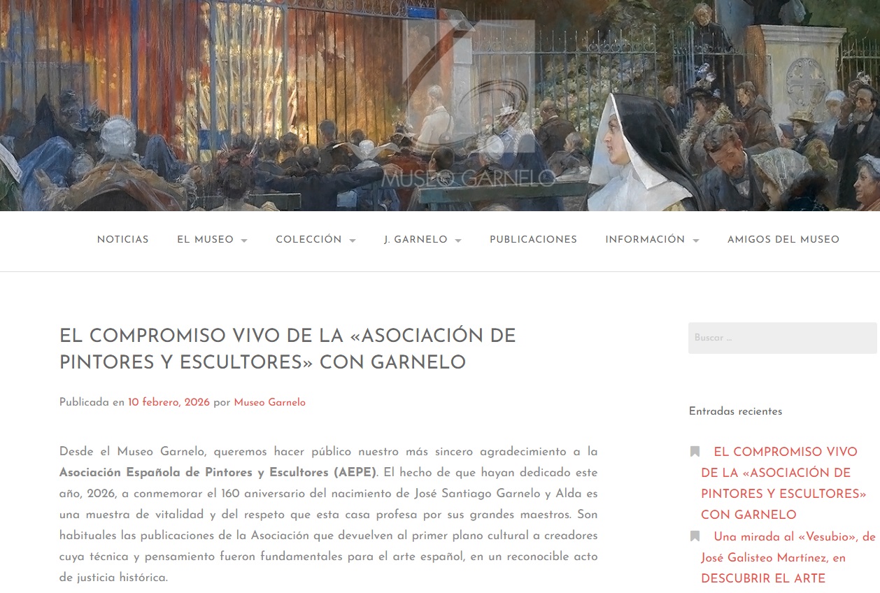 El Museo Garnelo de Montilla, Córdoba, dedicado a la memoria de quien fuera un excelente pintor y Secretario de la Asociación Española de Pintores y Escultores y Director de la Gaceta de Bellas Artes en 1912, acaba de reconocer con una publicación especial, la difusión que desde la AEPE viene haciendo en este año 2026, recordando cada mes en su web, en la Gaceta de Bellas Artes y en las redes sociales en las que tiene presencia la centenaria entidad, se está haciendo del artista, contribuyendo a visibilizar su biografía y su obra, y rescatando del olvido a un maravilloso artista.
