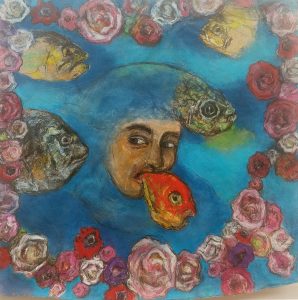 Rhapsody in blue (Sobre la obra homónima de George Gershwin). Mixta (óleo, tinta, elementos naturales y collage sobre fondos realizados con esmaltes metálicos) / madera en planos superpuestos. 97 x 146