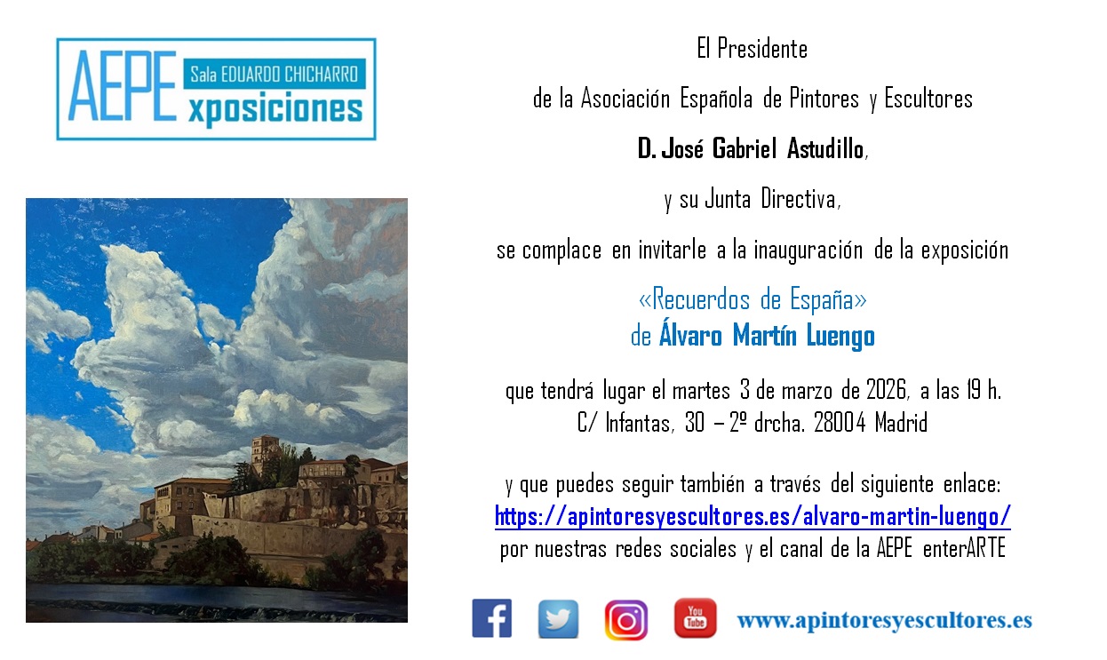 Todo ello puede seguirse además por el canal de la AEPE en Youtube y por las redes sociales en las que tiene presencia la Asociación Española de Pintores y Escultores.