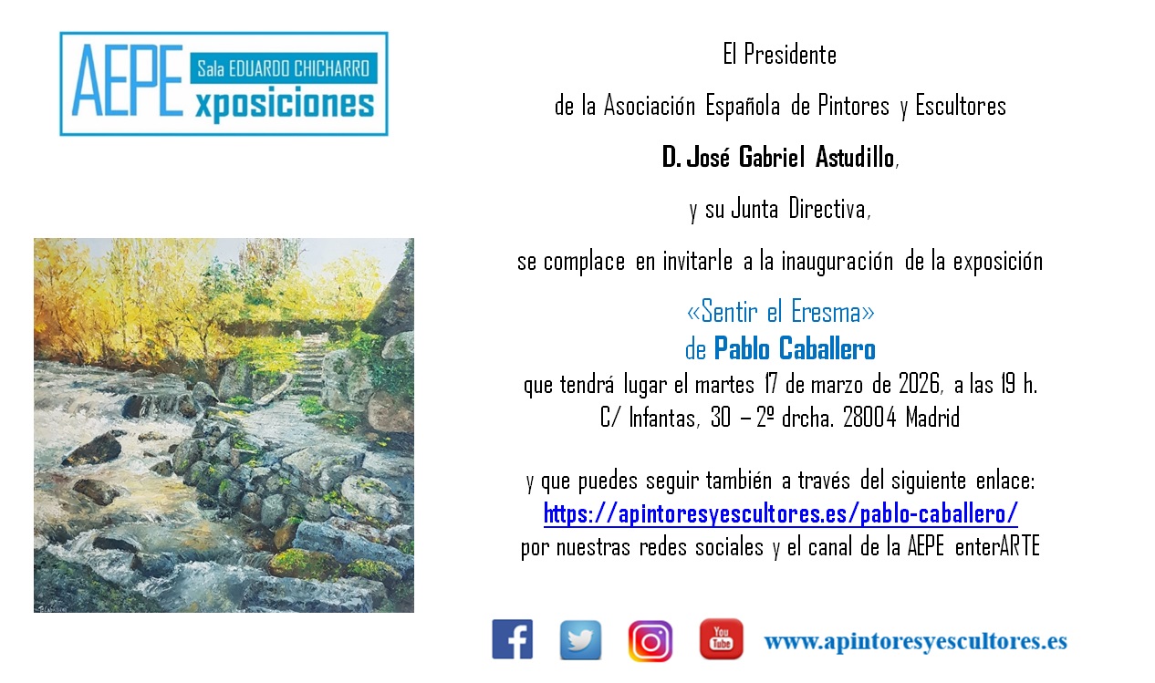 El 17 de marzo de 2026, en la Sala de Exposiciones «Eduardo Chicharro» de la Asociación Española de Pintores y Escultores, tendrá lugar el acto de inauguración de la exposición que bajo el título de «Sentir el Eresma», nos presentará el socio Pablo Caballero.