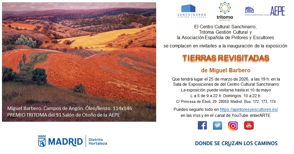 El día 25 de marzo de 2026, a las 19 h., en el Centro Cultural Sanchinarro, perteneciente a la Junta Municipal de Hortaleza, tendrá lugar el acto de inauguración de la exposición “Tierras revisitadas”, del socio Miguel Barbero Llorente, ganador del Premio Tritoma del 91 Salón de Otoño de la AEPE.