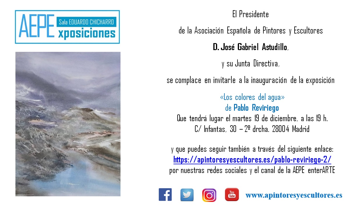El 19 de diciembre de 2025, en la Sala de Exposiciones «Eduardo Chicharro» de la Asociación Española de Pintores y Escultores, tendrá lugar el acto de inauguración de la exposición que bajo el título de «Los colores del agua», nos presentará el socio Pablo Reviriego.