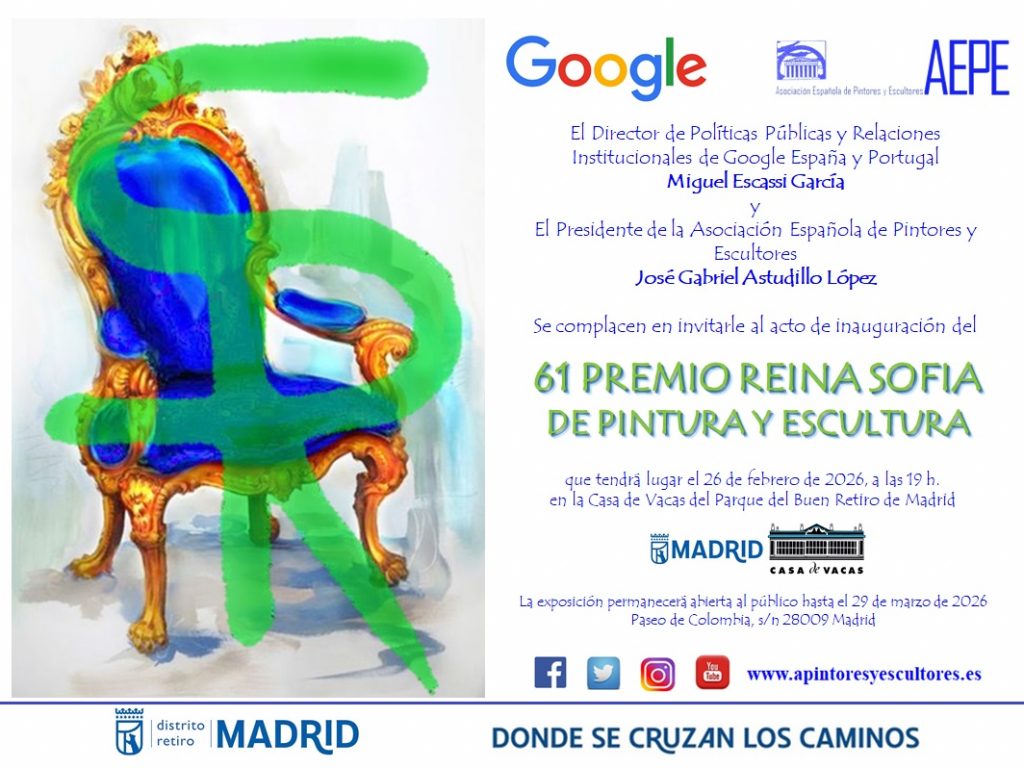 El Consejero de Cultura de la Comunidad de Madrid, Mariano de Paco, el Presidente de la Asociación Española de Pintores y Escultores, José Gabriel Astudillo López, el Director de Google España y Portugal, Miguel Escassi, y la Secretaria General de la AEPE y Secretaria del Jurado, Mª Dolores Barreda Pérez presidirán el jueves 26 de febrero de 2026, a las 19 h, en la Casa de Vacas del madrileño Parque del Buen Retiro, el acto en el que se dará a conocer el fallo del Jurado y se llevará a cabo la entrega del 61 Premio Reina Sofía de Pintura y Escultura, que organiza la Asociación Española de Pintores y Escultores y cuenta con la colaboración de Google.