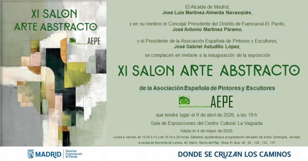 El próximo día 9 de abril de 2026 se inaugura la exposición de obras del XI Salón de Arte Abstracto de la Asociación Española de Pintores y Escultores, en la Sala de exposiciones del Centro Cultural La Vaguada, de la Junta Municipal de Fuencarral-El Pardo, que se podrá visitar hasta el 4 de mayo de 2026.