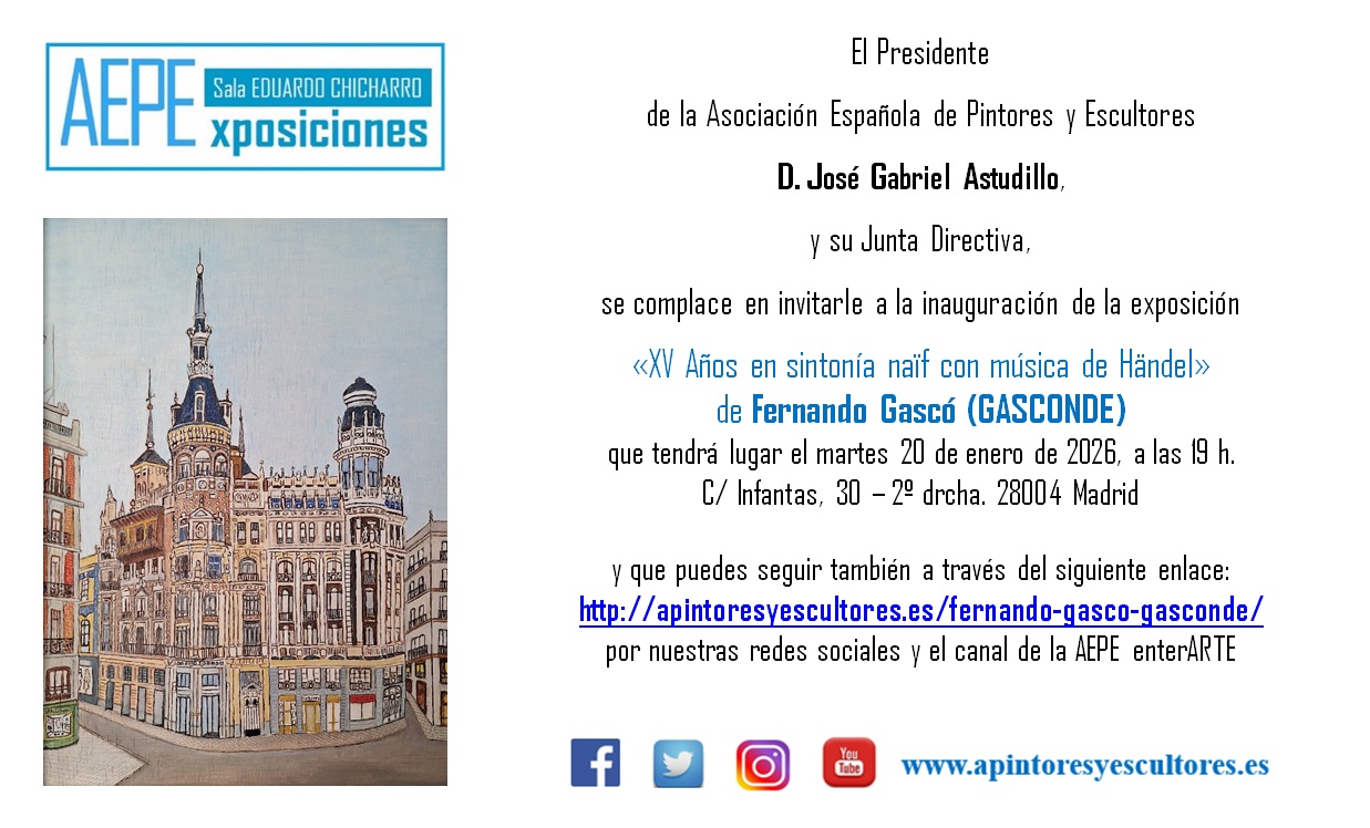 El 20 de enero de 2026, en la Sala de Exposiciones «Eduardo Chicharro» de la Asociación Española de Pintores y Escultores, tendrá lugar el acto de inauguración de la exposición que bajo el título de «XV Años en sintonía naïf con música de Händel», nos presentará el socio Fernando Gascó GASCONDE.