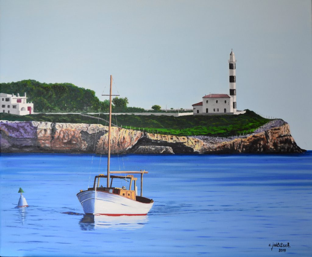Obra marina inspirada en el amanecer de un dia tranquilo con el mar en calma y un pescador volviendo a puerto después de una noche de intensa pesca en Porto Cristo (Mallorca).