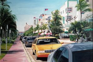 Taxi Amarillo (Ocean Drive, Miami ). Óleo / lienzo. 81 x 116