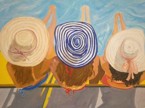 Amigas, piscina y sombreros. Óleo / lienzo. 60 x 92