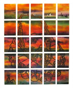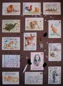 Carnaval de los animales (Sobre la obra homónima de Camile S. Saëns). Políptico (14). Lápiz color / papel de corteza de morera elaborado a mano montados sobre madera entelada. 148 x 110