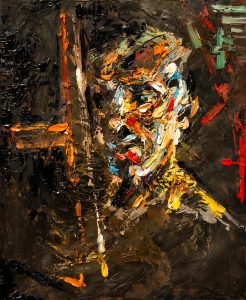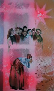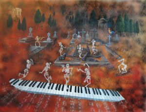 Dance macabre (Sobre la obra homónima de Camile Saint-Saëns). Óleo, lápiz y esmaltes sintéticos tratados con técnica crack / madera. 115 x 150