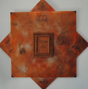 Leonardo ocupa el centro. Lápiz y esmaltes metálicos sobre madera. Lienzo central abatible. 150 x 150