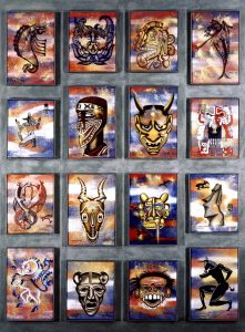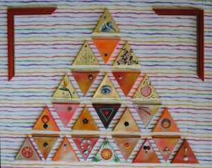 Mosaico de oportunidades. Políptico (25). Óleo y elementos naturales / lienzos triangulares con fondos de esmaltes metálicos montados sobre madera entelada. 120 x 150