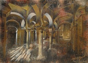 Toledo. Noche en la mezquita de Bab-al- Mardum. Óleo, lápiz y esmalte sintético / papel. 50 x 70