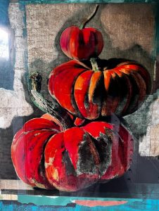 Calabazas. Mixta. Pintura en tabla, collage, impresión en metacrilato. 90 x 70