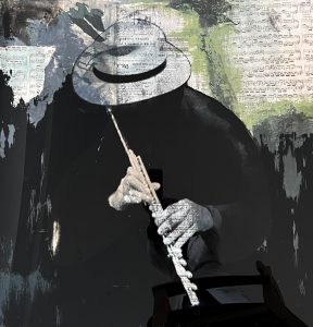 Músico. Mixta. Pintura en tabla, collage, impresión en metacrilato. 90 x 90